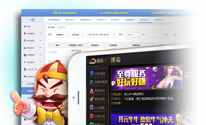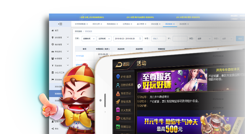 全智能后台管理系统、代理系统、活动系统。内置多款经典营销活动,可自由设置活动规则,转盘,红包,签到,存款赠送等。让您一劳永逸,没烦恼。